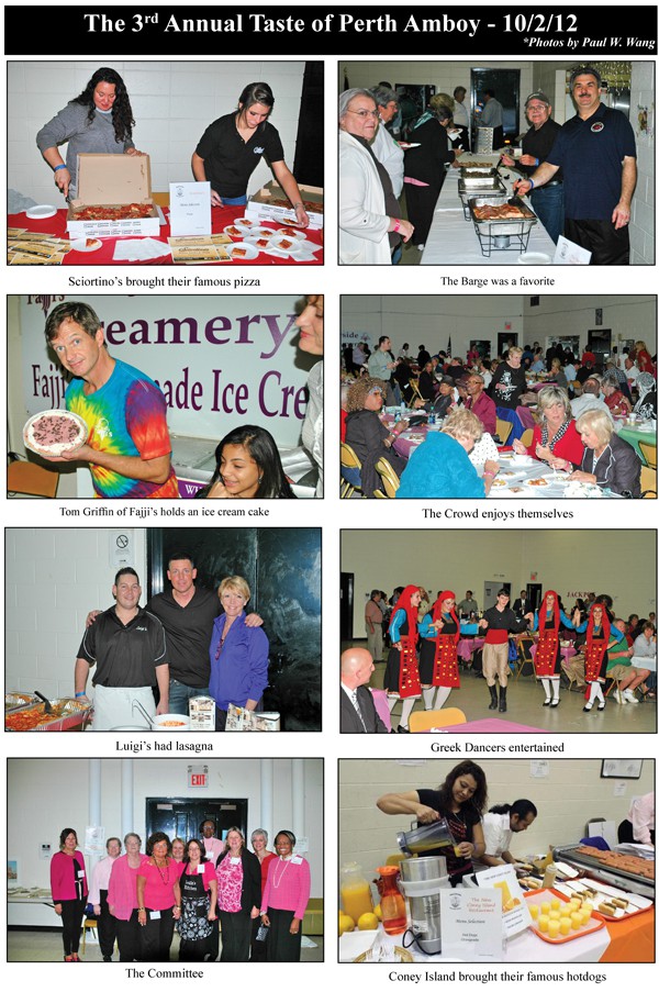 PERTH AMBOY — On Tuesday October 2, 2012, 15 restaurants (and one local business) participated in the 3rd Annual Taste of Perth Amboy at St. Demetrios Greek Orthodox Church sponsored by the Friends of the Perth Amboy Free Public Library. They were: The New Coney Island Restaurant, Karini II, Fajji’s Bayside Creamery, Troy, Mama Lena’s, Latin Grill, The Barge, Terrazza, Seabra’s Armory, Z.P.A., Tropical Cheese, Sipos Bakery, Portuguese Manor, Asian Buffet, Luigi’s Ristorante Pizzeria and Sciortino’s. Over 200 patrons enjoyed food from a number of different ethnic backgrounds as they discovered Perth Amboy’s unique flavor through tasting food. Greek Dancers entertained the crowd. Door prizes were given and there was a silent auction. Music from D.J. Andy Rios entertained the crowd. Proceeds from the event went to benefit the renovation of the library. Historic Calendars were on sale to benefit both the Friends and the Kearny Cottage Historical Society.
