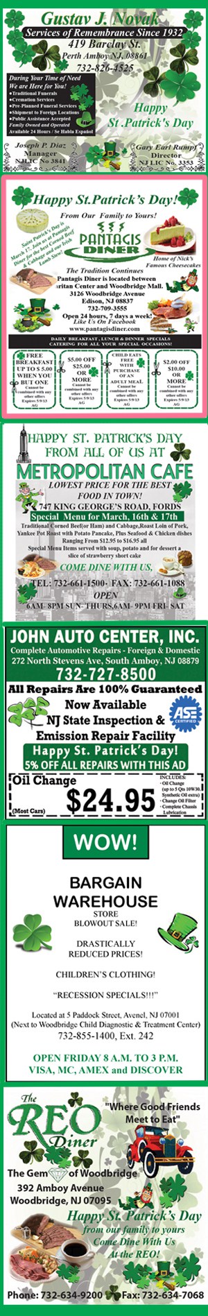 McArthur Ave in Sayreville. The price is $35 pp and includes a corned beef meal, open bar and incredible entertainment with live music, a bag piper presentation, and an amazing step dance show. For more info call Joe O’ Campbell @ 732-727-7178