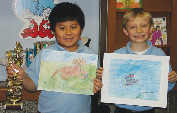 FORDS — At Our Lady of Peace School in Fords, 2nd Grader Sebastian Pridady is proudly holding the trophy he just received from Bearcat Basketball. He is also holding some of his artwork with help from his classmate Paul Di Carlo.
