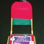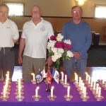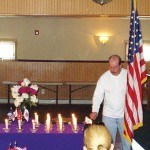 Gary Lyons, John Lynch, and Jim Dadon behind ceremonial table. Candles are lit for each deceased member and then put out as each name is read. A ceremonial Empty chair is reserved for POWs/MIAs.