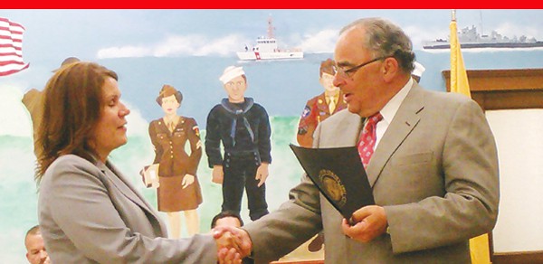 PERTH AMBOY — A representative from Kushner Companies receives a proclamation from Mayor Wilda Diaz. This was in appreciation for services the Kushner Companies rendered during the cleanup of the Waterfront after Superstorm Sandy.