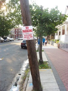 Lo and behold, on the afternoon of Monday, August, 26 there was a sign posted on that pole. The sign says, “No parking August 27 by order of the Police.” This pole is slated for repairs that day.