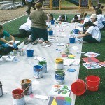 - Volunteers paint some canvas murals