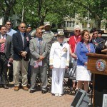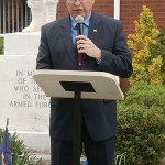 - Mayor Fred Henry speaks in front of the Memorial at South Amboy City Hall.