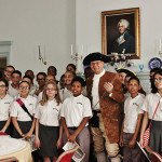 Kurt Epps as Royal Governor William Franklin & Perth Amboy Catholic School students in the center hall of the Proprietary House.
