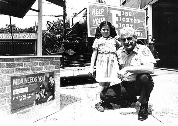 PERTH AMBOY - Perth Amboy Firefighter John Siberry poses for a photo with a young girl beside the poster for the Muscular Dystrophy Telethon featuring Jerry Lewis. *Photo Courtesy of John Siberry This Photo was restored under a grant for the Kearny Cottage Archiving project by the Middlesex Cultural and Heritage Commission