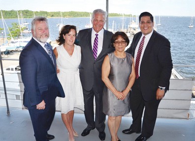 Pictured are the honorees of the 30th Annual Roberto Clemente Gala (L to R) John Ballantyne, Northeast Regional Council of Carpenters; Etta Rudolf Denk, Bank of America; James J. Elek, J.J. Elek Realty; Ana Maria Zevallos, Zevallos/Skrocki Home for Funerals; and Abraham López