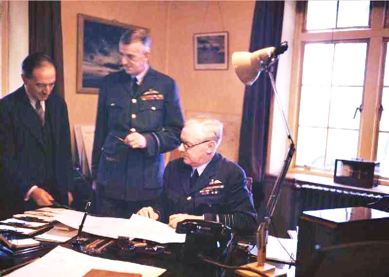 Air Chief Marshal Sir Arthur T Harris, Commander in Chief of Royal Air Force Bomber Command, discussing an operation with the Senior Air Staff Officer, Air Vice Marshal R D Oxland, CB, CBE, and Mr M T Spence, OBE. Source: Wikimedia.