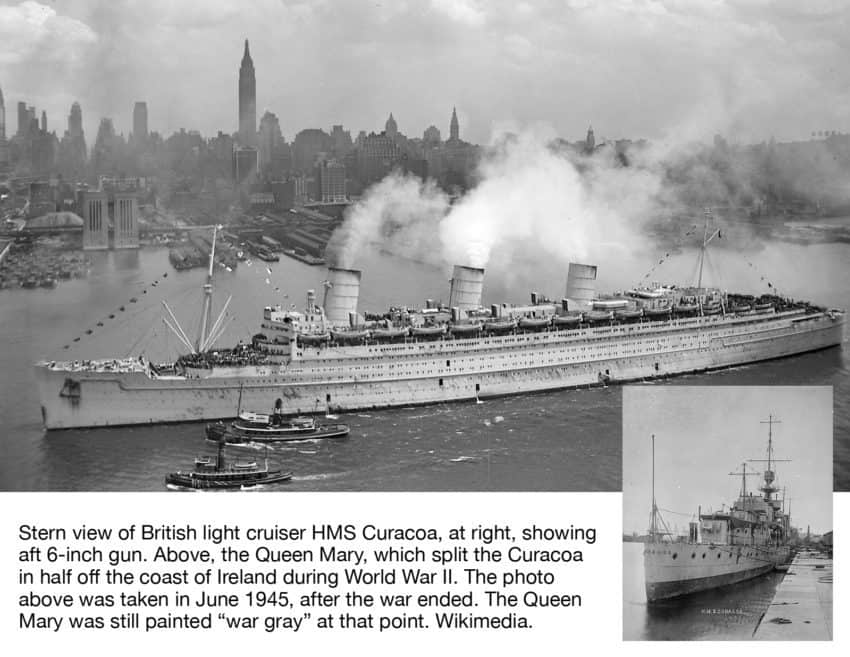 On October 2, 1942, while zig-zagging, the liner (now a troopship) SS Queen Mary — carrying around 10,000 troops of the U.S 29th Infantry Division — collides with its escort, the British cruiser HMS Curacoa off the coast of Donegal, Ireland. Curacoa is sliced in half, and sinks; 338 sailors drown. On Madagascar, British troops occupy Antsirabe, the third-largest city on the island, located around 60 miles south of the capital, Tananarive.