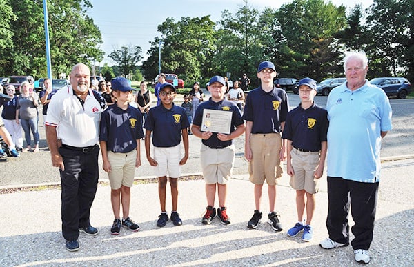 SOUTH AMBOY/SAYREVILLE – The South Amboy Elks Donated $ 650 grant. and Certificate from Elks National Foundation committee to Sayreville Jr. Police academy cadets for Uniform Shirts and hats. Denotes, Elks Care, Elks Share In photo from left to right is Lodge National Foundation Chairman Valentine Tarr. The top five graduates of the academy and Past Exalted Ruler, Past District Deputy Frank Glennon.
