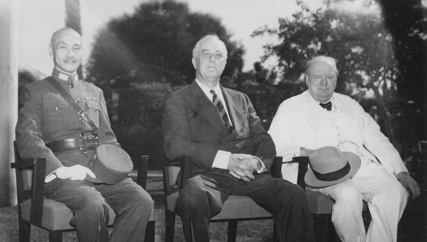 From left, Chiang Kai-shek, President Franklin Roosevelt, and British Prime Minister Winston Churchill in Cairo in 1943. For more information about Chiang, click on this link.
