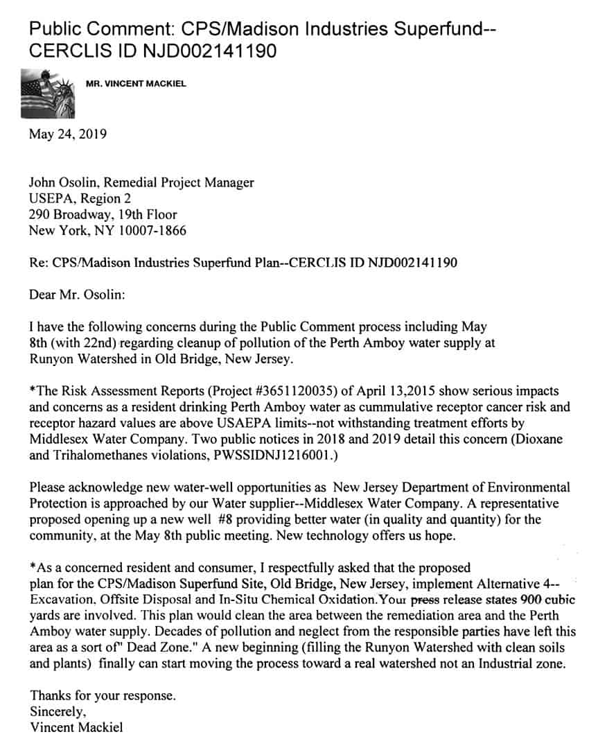 Mackiel continued, “We have to make sure that Buckeye is taxed properly. He then went on to talk about the water situation in Perth Amboy. “I don’t accept the version that went on YouTube. I talked about the seriousness of the water contaminants.” He then spoke ab out what Luis Perez Jimenez (Director of Operations at the USA-PA (Utility Service Associates Perth Amboy) Middlesex Water Company)) talked about regarding opening new wells. “I talked about doing remediations. We need a clean water supply. There are dead trees by the water supply, and we need a real watershed. The EPA (Environmental Protection Agency) has to create a partial study or a testing gate to see how the cleanup will proceed. The City has to be a part of this.” See letter he submitted, below.