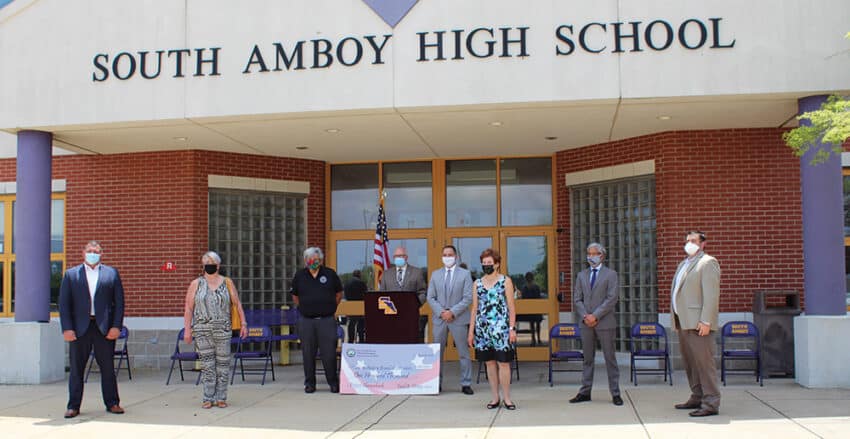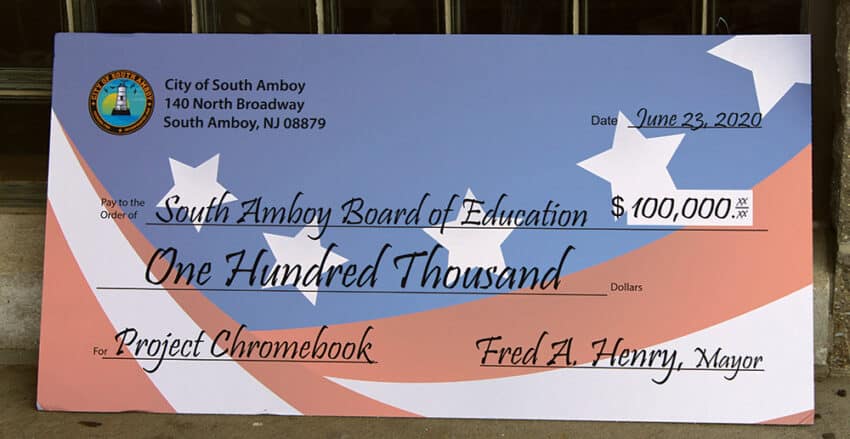 SOUTH AMBOY – As redevelopment continues in the City of South Amboy, the City Government and South Amboy Redevelopment Agency have taken a major step to bring improvements to benefit all residents that would not have been possible without their collective efforts. Tuesday, June 23rd Mayor Fred Henry and Executive Director of Redevelopment Eric Chubenko presented a check in the amount of $100,000 to Superintendent of Schools Jorge Diaz and Board of Education President Anthony Conrad to begin the process of equipping every South Amboy Public School student with a Chromebook computer. The check represents a third of the cost involved with a goal to fund the remaining two thirds of the project through impact fees collected by the Redevelopment Agency.