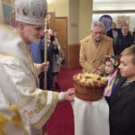 PERTH AMBOY – On Sunday, November 28, 2021, Metropolitan-Archbishop visited the Ukrainian Catholic Church of the Assumption of the Blessed Virgin Mary in Perth Amboy. Rev. Ivan Turyk, Deacon Paul Makar and parish trustees welcomed the archbishop to the parish at the door of the church. Two children welcomed Metropolitan Archbishop Borys Gudziak with bread (on traditional Ukrainian cloth), salt, and flowers. This long-standing Ukrainian tradition symbolizes eternity (bread) and hospitality (salt). Pastor of the Ukrainian Catholic Church of the Assumption of the Blessed Virgin Mary, Rev. Ivan Turyk presented the archbishop with a cross.