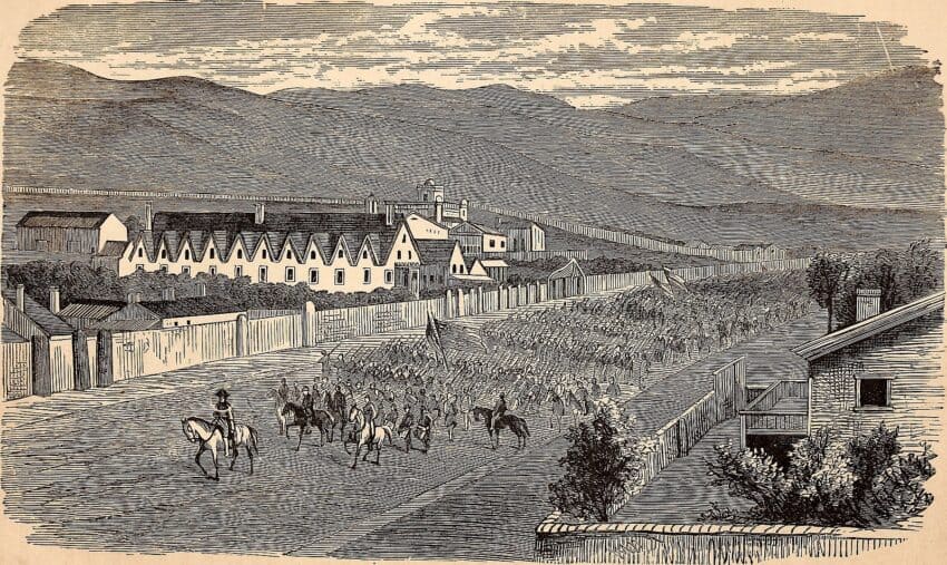On April 8, Sibley’s Brigade, whose supply train had been destroyed at Glorieta Pass in March, leaves Santa Fe, New Mexico Territory, in a retreat down the Rio Grande Valley toward Albuquerque.